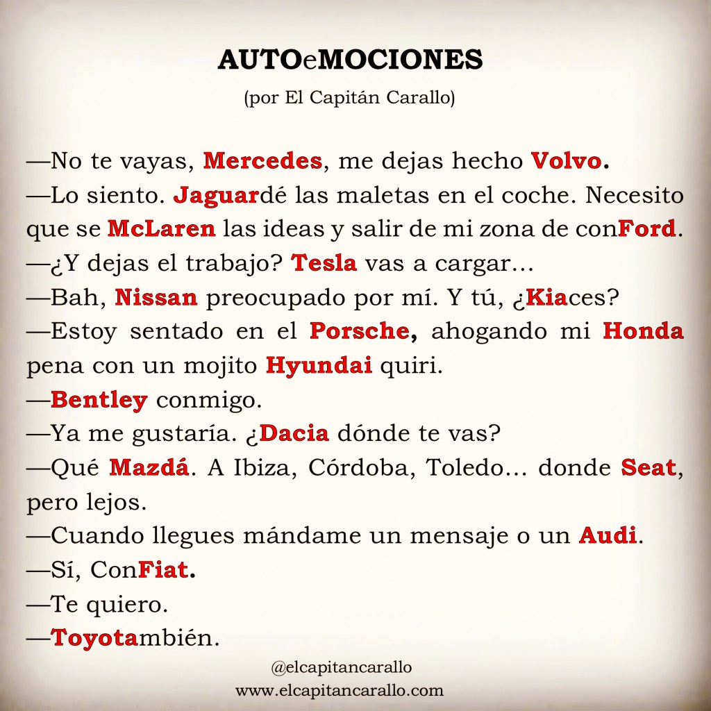 juegos de palabras AUTOeMOCIONES Fecha: 28 octubre, 2021Autor/a: El Capitán Carallo https://www.safecreative.org/work/2110289652116-autoemociones Más juegos de palabras en https://elcapitancarallo.com/category/juegos-de-palabras/ Comparte esto: Compartir en X (Se abre en una ventana nueva) X Comparte en Facebook (Se abre en una ventana nueva) Facebook Me gusta Cargando...